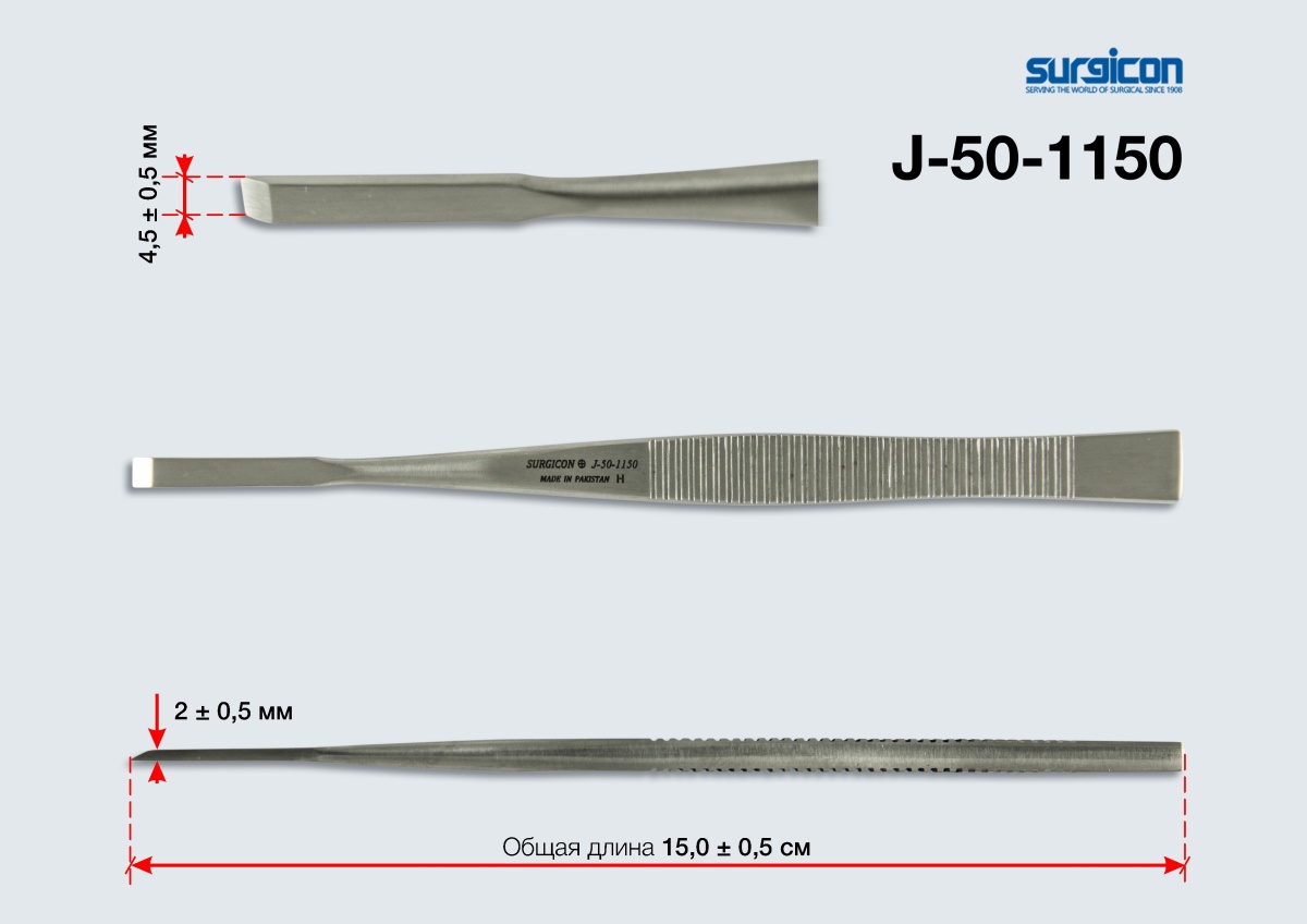 Наименование-Долото. Тип инструмента-ударный с острой кромкой. Описание-Управляемый вручную хирургический инструмент с профилированным краем для соскабливания вперед (острым или тупым, иногда двусторонним), применяемый для поднятия и/или отделения надкостницы (оболочки из волокнистой соединительной ткани, покрывающей поверхность кости) от подлежащей кости через толкающее усилие, как правило, применяемое вдоль продольной оси кости. Это обычно однокомпонентный инструмент, изготовленный из высококачественной нержавеющей стали; он доступен в широком диапазоне размеров и конструкций лезвия [например, тонкое или прочное, изогнутое, ложкообразное или плоское (долотообразное)]. Это изделие многоразового использования.. Вид-многоразовый. Форма-прямая. Общая длина, мм-150±0,5мм. Ширина рабочей части по горизонтали, мм-4,5±0,5мм. Рабочая часть-односторонняя заточка. Толщина-рабочей части 2±0,5мм. Наковаленка-нет. Тип рукоятки-цельнометаллическая уплощенная с продольной насечкой для руки. Марка стали-медицинская нержавеющая сталь. Вид поверхности-Матовая антибликовая поверхность для исключения отражающего эффекта. На поверхности не должно быть трещин, раковин, забоин, царапин, выкрошенных мест, заусенцев, расслоений, пережогов и других загрязнений (окалин, материалов шлифовки, полировки и следов смазки).
