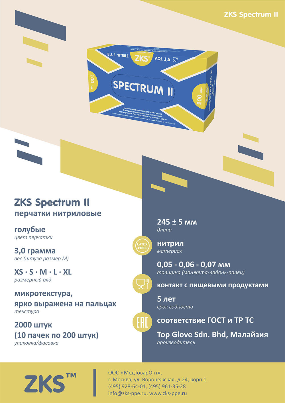 Перчатки "ZKS" нитриловые "Spectrum II" голубые (вес штуки М - 3,0 г) 100 пар